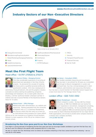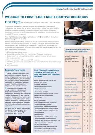 The document is a website for First Flight Non-Executive Directors, a UK-based specialist provider of non-executive directors and chairpersons. It summarizes First Flight's services and unique selling points, including its large database of over 7,000 candidates, proven track record of over 170 successful assignments, and affordable success-based fees. It also provides examples of companies First Flight has successfully placed non-executive directors with across different industries.