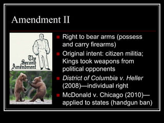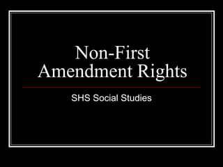 The document summarizes several non-First Amendment rights protected by the U.S. Constitution, including the right to bear arms (2nd Amendment), privacy rights (4th Amendment), and prohibitions against cruel and unusual punishment (8th Amendment). It also provides data on the death penalty in the U.S. in 2008, noting that 37 executions were carried out mostly by lethal injection, the majority of those executed were men, and crimes eligible for the death penalty vary by state and federal laws.