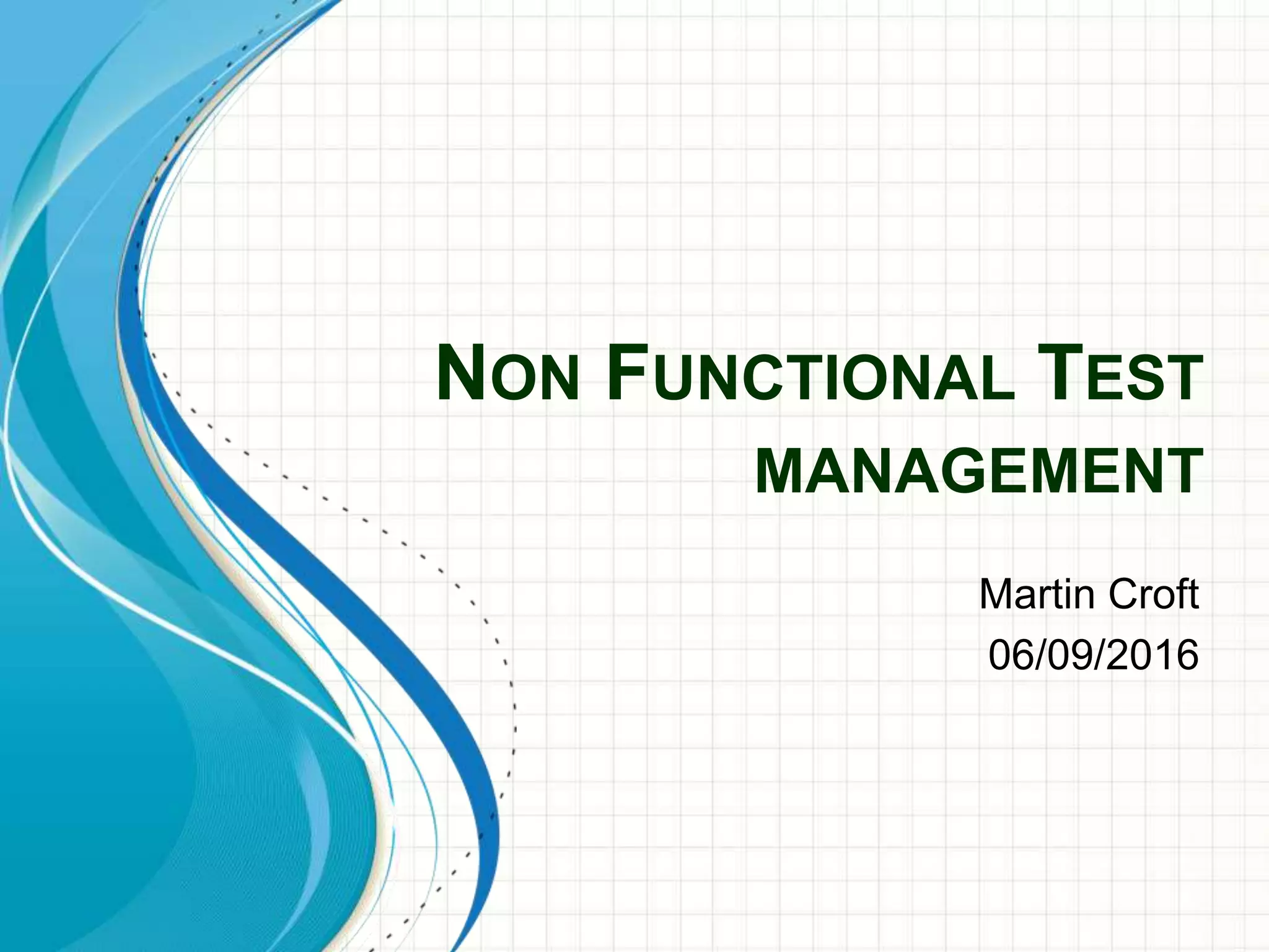 The document discusses non-functional testing (NFT) and provides advice on common issues, managing risk, and areas for improvement. It notes that NFT is often poorly defined, planned, and executed. It recommends fostering common understanding of NFT, engaging stakeholders early, setting clear test catalogs, and integrating NFT into design, development, and monitoring. The document also provides the author's experience and contact information for consulting services.