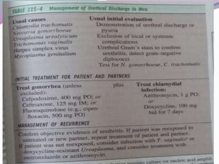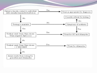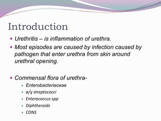 The document discusses urethritis, detailing its causes, including both gonococcal and non-gonococcal types, with a focus on infectious agents such as Chlamydia trachomatis and Ureaplasma urealyticum. It outlines diagnostic methods, treatment regimens, and potential complications, emphasizing the importance of both patient and partner treatment. Additionally, it describes various clinical features and risk factors associated with the condition, along with laboratory diagnostics for effective management.