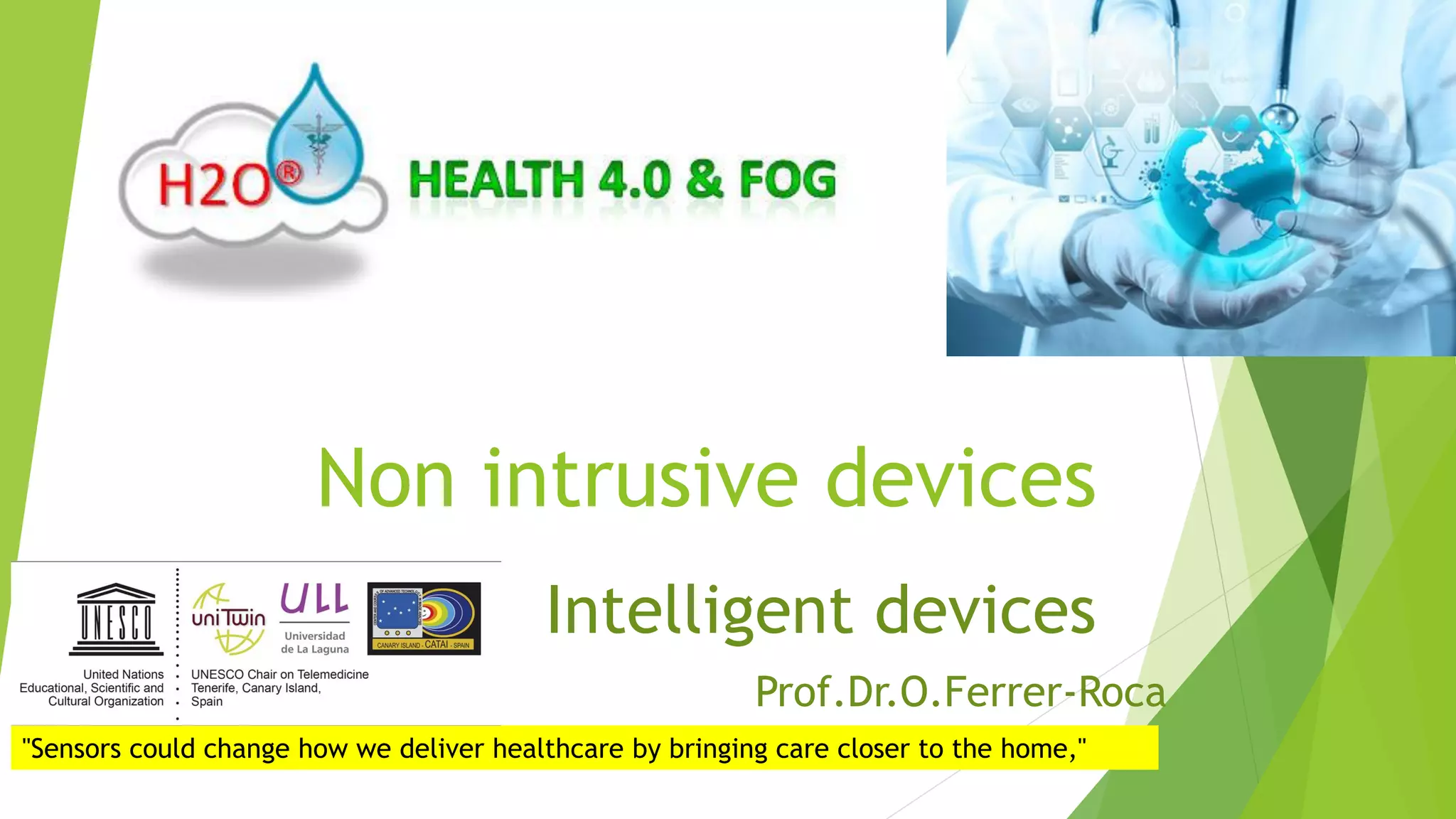 This document discusses how new sensor and intelligent device technologies have the potential to transform healthcare delivery by bringing care closer to patients' homes. It describes how these non-intrusive technologies could enable patients to recover more quickly after surgery and benefit from virtual reality applications. The document also examines how wearable devices and sensors that can monitor vital signs could support more integrated, patient-centered care models by reducing dependence on providers and facilitating remote care, monitoring and early detection of health issues. Machine learning and big data analytics are discussed as ways to generate insights from the large and growing volumes of patient data that these new digital devices and sensors are capturing.