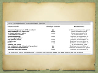 Non-invasive ventilation (NIV) offers alveolar ventilation without invasive airway control, minimizing complications from endotracheal intubation. It includes various types, such as negative and positive pressure ventilation, with interfaces like nasal masks and helmets, adapting to the patient's condition. NIV is indicated for acute respiratory failure in conditions like COPD and cardiogenic pulmonary edema, demonstrating reduced need for intubation and improved patient outcomes, but with limitations such as air leaks and intolerance.