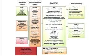NIV, or non-invasive ventilation, is a form of ventilation therapy that is applied non-invasively through a mask rather than an endotracheal tube. It is commonly used to treat conditions like COPD exacerbations, pulmonary edema, and respiratory failure. Key settings that must be adjusted include IPAP, EPAP, Ti min/max, trigger sensitivity, and backup rate. Modes include spontaneous, timed, and bi-level positive airway pressure. Proper mask fitting and troubleshooting issues like leaks are important for ensuring effective ventilation. Regular monitoring of parameters like ABGs, SpO2, and ventilation is needed to optimize NIV therapy.