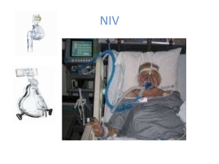 Non Invasive Ventilation (NIV) involves delivering mechanical ventilation without the use of an endotracheal tube or surgical airway, instead using a tight-fitting face or nasal mask. NIV has been used since the 1940s but became more widely used starting in the 1980s for conditions like sleep apnea. It is now commonly used to treat acute respiratory failure from COPD exacerbations and cardiogenic pulmonary edema. NIV can be delivered via CPAP or BiPAP and involves optimizing settings like IPAP, EPAP, respiratory rate and oxygen flow to improve ventilation and oxygenation without the need for intubation. Proper patient selection, interface choice, and monitoring are important for successful NIV treatment.