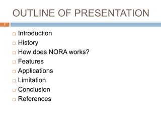 Non-Obvious Relationship Awareness (NORA) is a data mining system developed by Jeff Jonas in 1989, initially for casino fraud detection, which identifies relationships between individuals and organizations using multiple datasets. It features real-time analytics and is employed across various sectors, including law enforcement and retail, although it raises privacy concerns and relies heavily on data quality. Today, NORA is recognized for its broad applicability and potential in enhancing security and fraud detection.