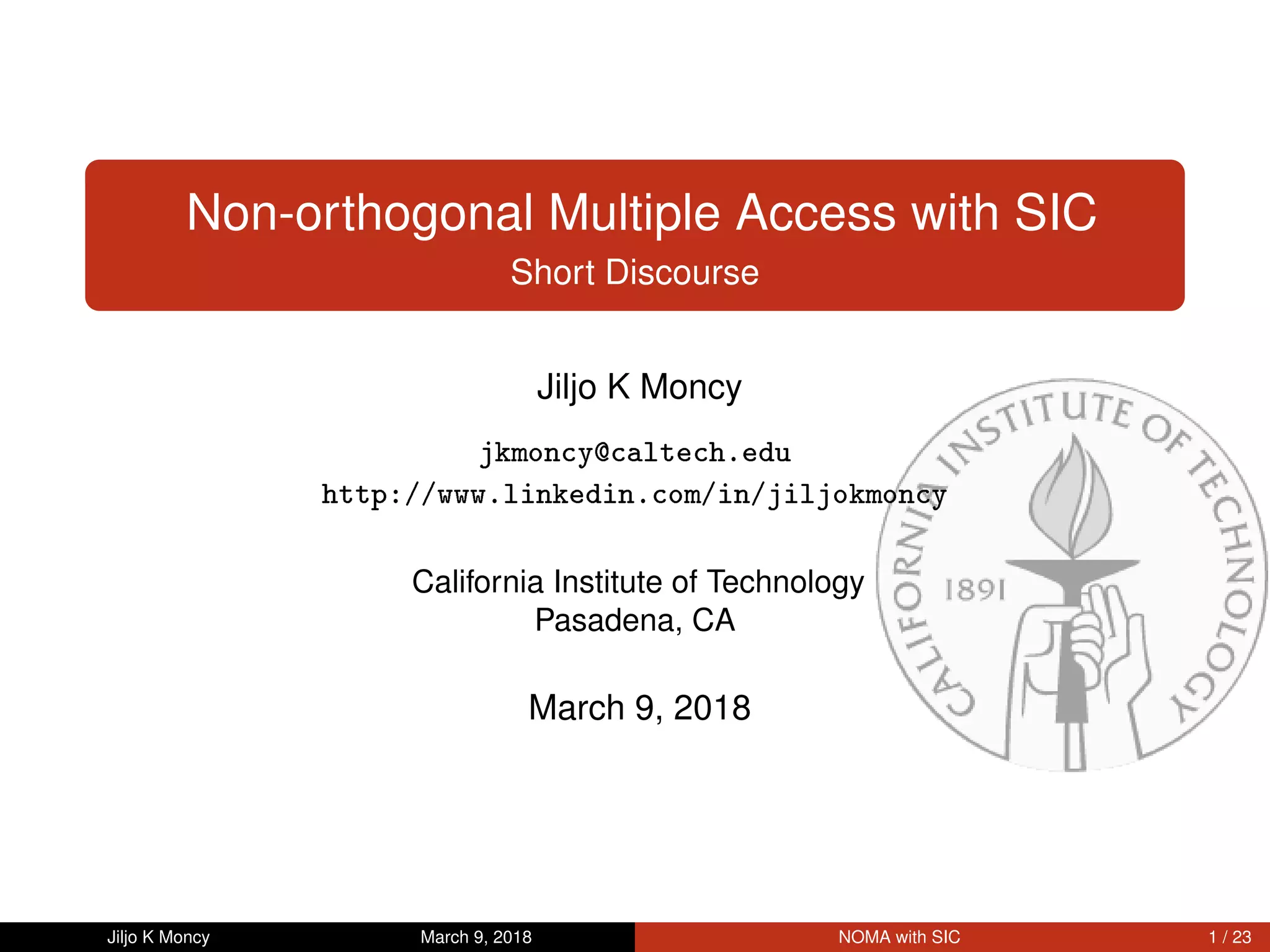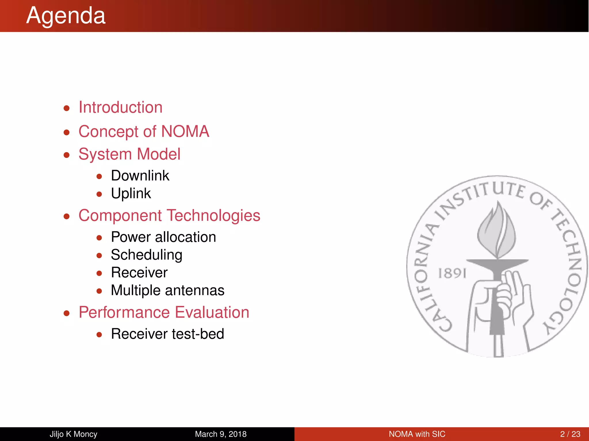The document discusses Non-orthogonal Multiple Access (NOMA) with Successive Interference Cancellation (SIC). It introduces NOMA and how it differs from Orthogonal Multiple Access. NOMA allows signals to be superimposed in the power domain and uses SIC at receivers. The document covers NOMA system models for downlink and uplink transmission, component technologies like power allocation and scheduling, performance evaluations that show higher throughput compared to OFDMA, and concludes that NOMA provides efficient spectrum usage and is compatible with technologies like MIMO and LTE.