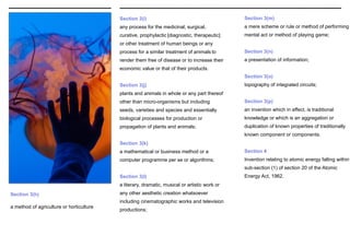 An invention must satisfy novelty, inventive step, and industrial applicability to be patentable. However, certain types of inventions are considered non-patentable under Sections 3 and 4 of the act, even if they satisfy the above criteria. These include inventions that are frivolous, contrary to natural laws, harmful to humans/animals, mere discoveries of scientific principles, known substances or processes, plants/animals, mathematical/business methods, artistic works, schemes, presentations of information, or topography of integrated circuits. Inventions relating to atomic energy are also non-patentable.