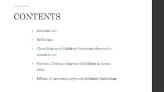 The document provides an overview of non-pharmacological behavior management techniques for children in dental settings. It discusses: