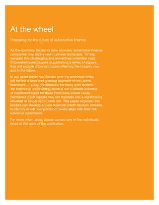 The document discusses how auto lenders should adapt their underwriting processes to evaluate non-prime borrowers effectively as more borrowers enter the non-prime segment due to economic hardship. It recommends that lenders supplement traditional credit scoring with subjective analysis, such as applicant interviews, to obtain additional contextual information and identify creditworthy non-prime applicants. Conducting interviews allows lenders to clarify inconsistencies in credit reports, understand the causes of credit blemishes, and assess an applicant's willingness and ability to repay a loan. Integrating subjective analysis into underwriting can help lenders navigate the complexities of evaluating non-prime borrowers and capture this growing market segment in a responsible way.
