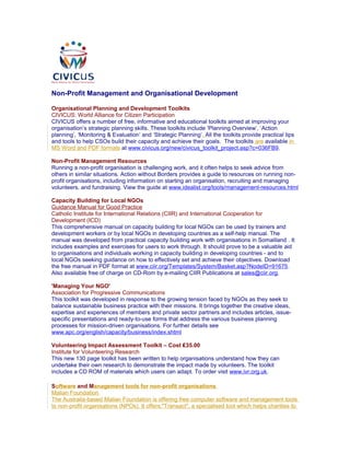 This document provides summaries of resources for non-profit management, including toolkits and guides on strategic planning, capacity building, risk assessment, participatory vulnerability analysis, business planning, workshop facilitation, and lobbying at intergovernmental meetings. The resources are available from organizations such as CIVICUS, Action Without Borders, the Catholic Institute for International Relations, the Association for Progressive Communications, the Institute for Volunteering Research, the Malian Foundation, ActionAid International, and the Stakeholder Forum for Our Common Future.