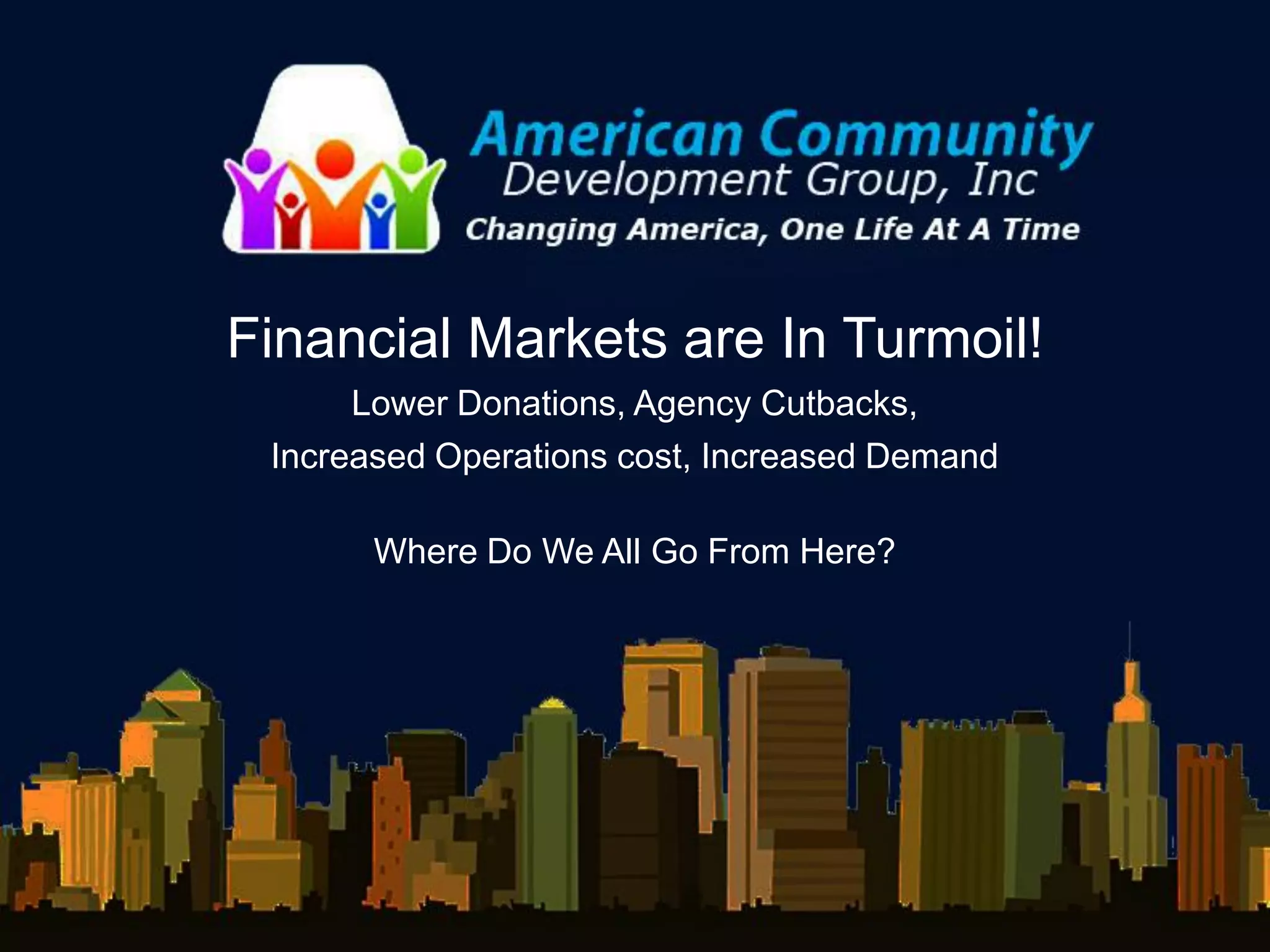 The document discusses a nonprofit survival kit offered by American Community Development Group to help nonprofits facing challenges from decreased donations and increased costs and demand. The kit provides tools, resources, relationships and solutions to strengthen organizations by improving revenue, efficiency, technology, staff training, communication, financing and capacity. The company acquires properties and businesses to generate cash flow and jobs to increase nonprofit revenues while benefiting veterans, the elderly, ex-offenders, the homeless and hungry. It invites the reader to discuss possibilities for partnership.