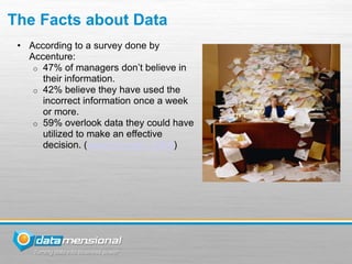 Datamensional provides business intelligence and data services to streamline knowledge for small and medium businesses using accurate, relevant, and timely data integrated from various sources and visualized through dashboards, reports, and analysis tools to help employees make more effective decisions. A survey found that many managers don't trust their information and use incorrect data frequently, showing a need for Datamensional's solutions to bridge the gap between employees' skills and the data available to them. Their end-to-end BI solutions include data integration, a data warehouse, and self-service analytics to analyze trends and details as needed.