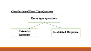 The document discusses non-standardized tests and their significance in evaluating students' understanding and abilities. It outlines various types of tests, including essay and short answer types, their advantages and disadvantages, and guidelines for constructing effective test items. The goal is to provide educators with tools to measure learning outcomes that go beyond mere factual recall.