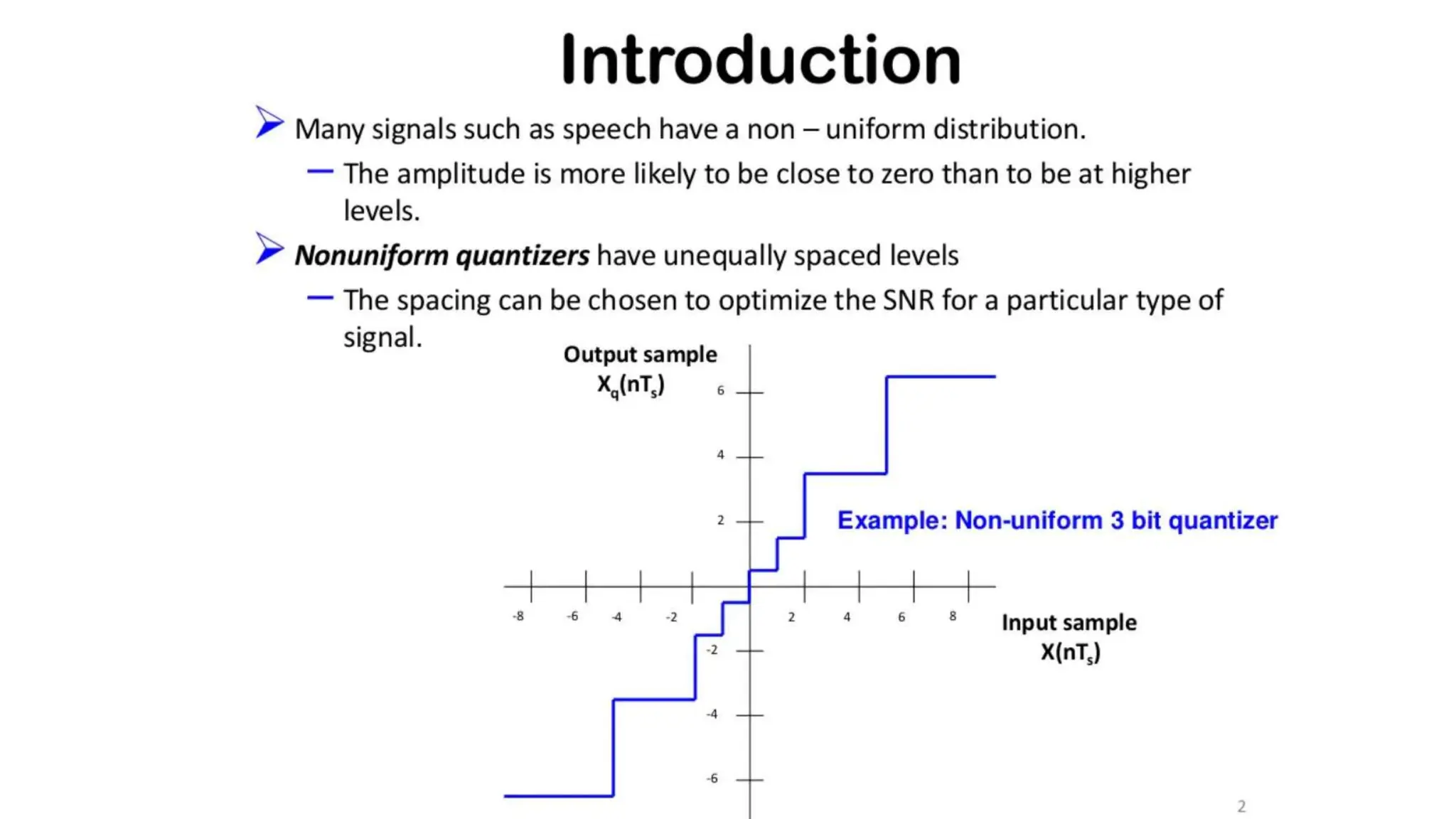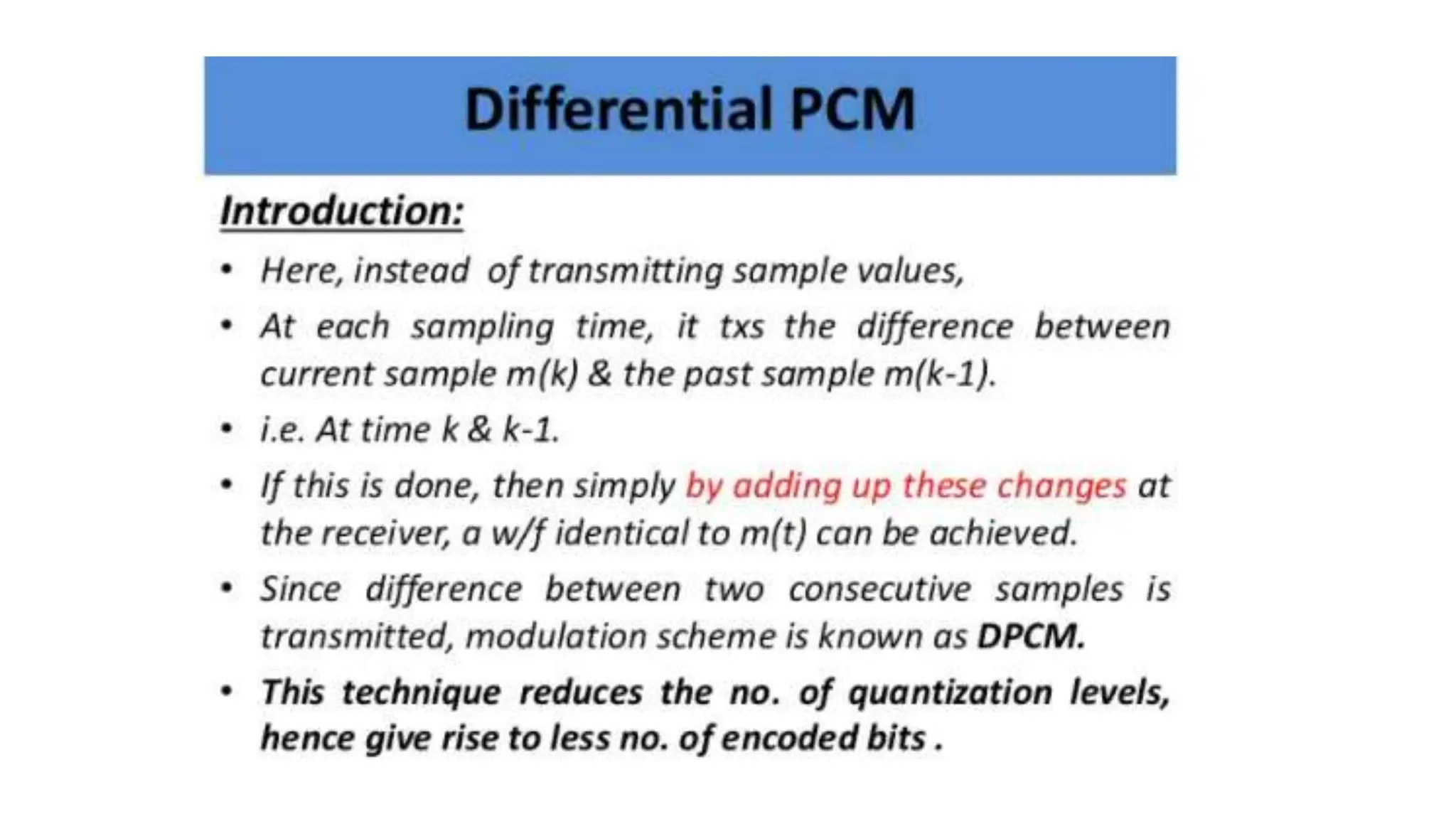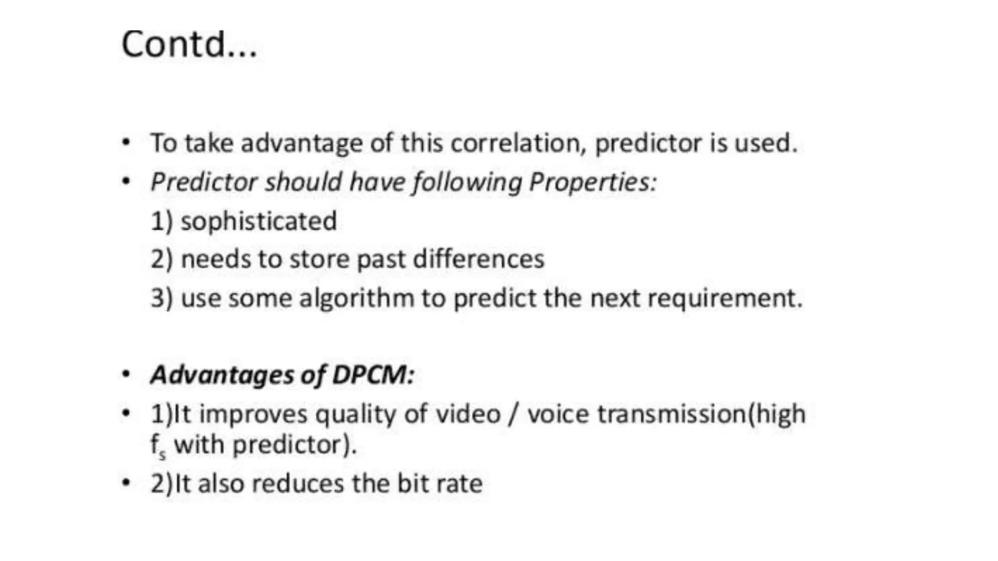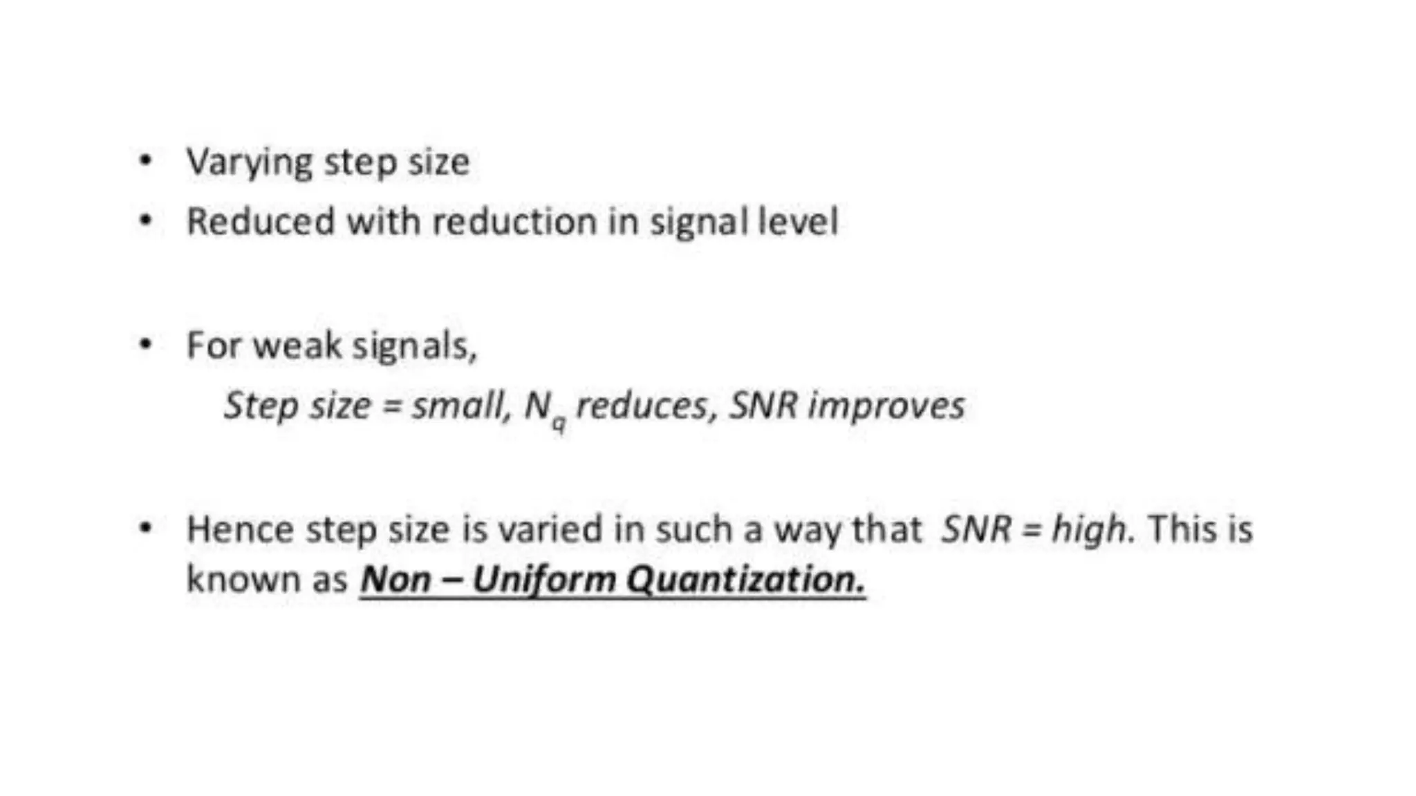 The document discusses non-uniform quantization and differential pulse code modulation (DPCM), highlighting redundancy in sampled signal values and the importance of reducing this redundancy to decrease bit rate. It then introduces delta modulation, characterized by a higher sampling rate and smaller quantization steps, resulting in a simpler design and moderate quality of output. The delta modulator includes a 1-bit quantizer and delay circuitry, facilitating effective signal representation.