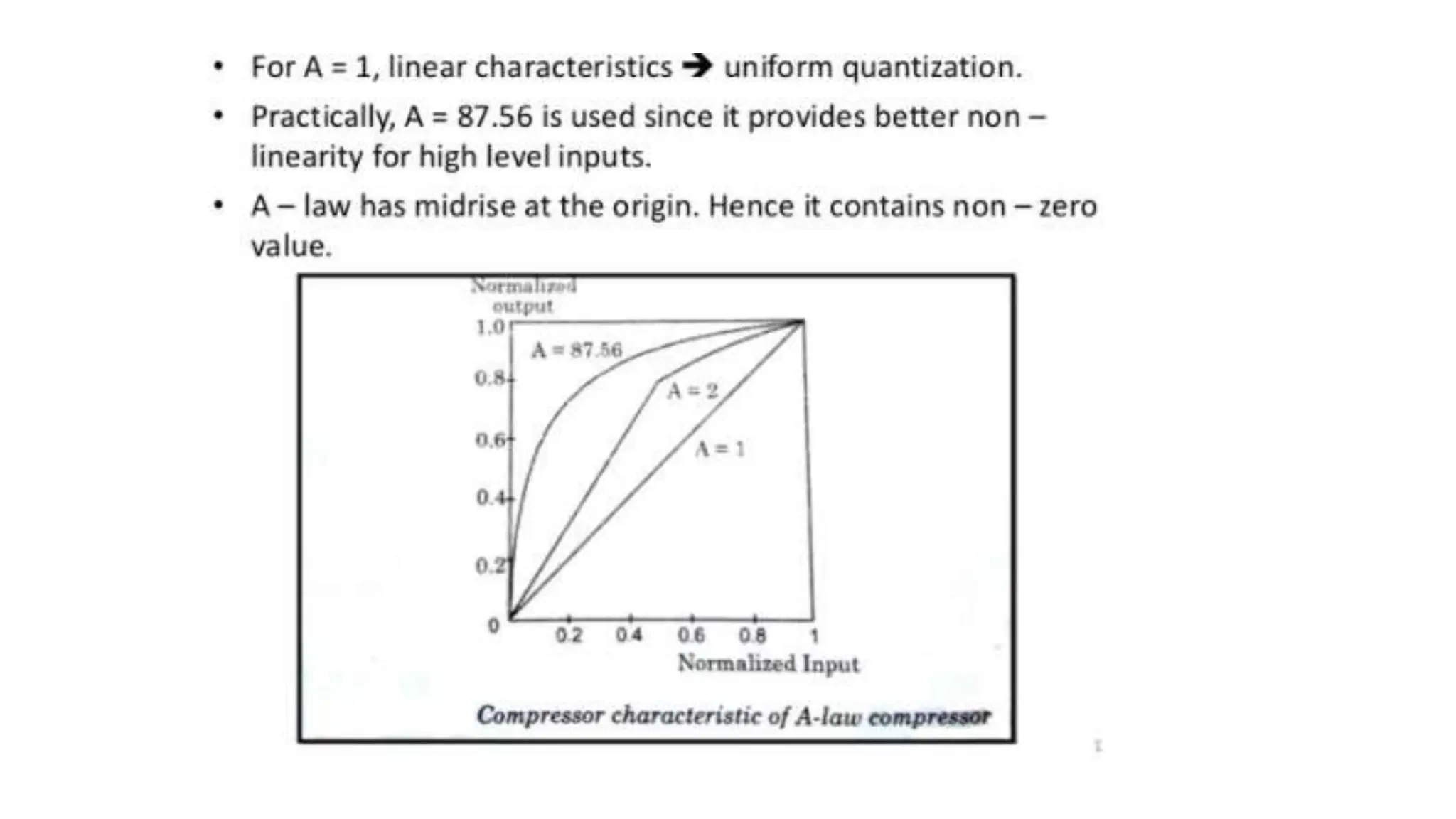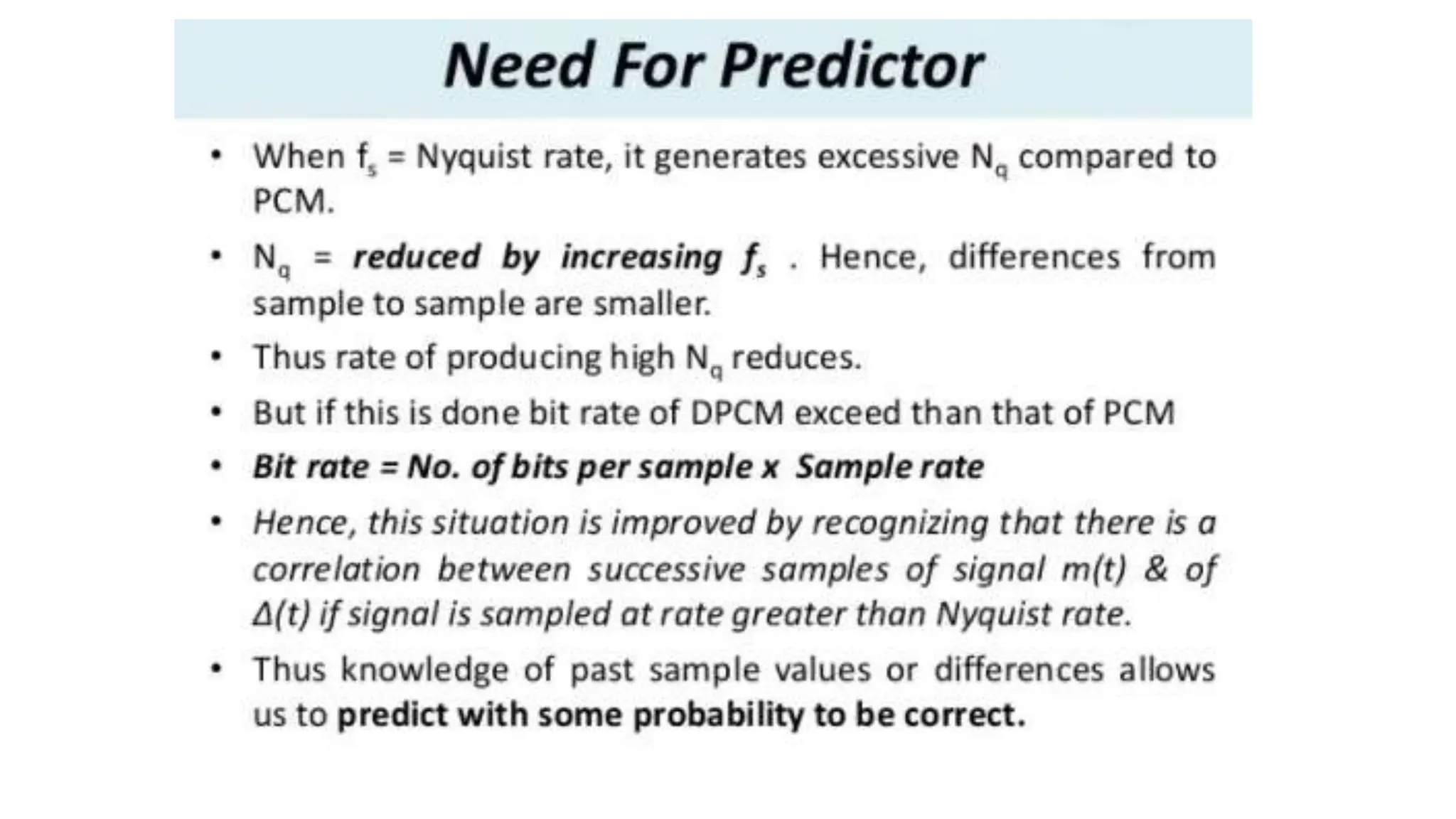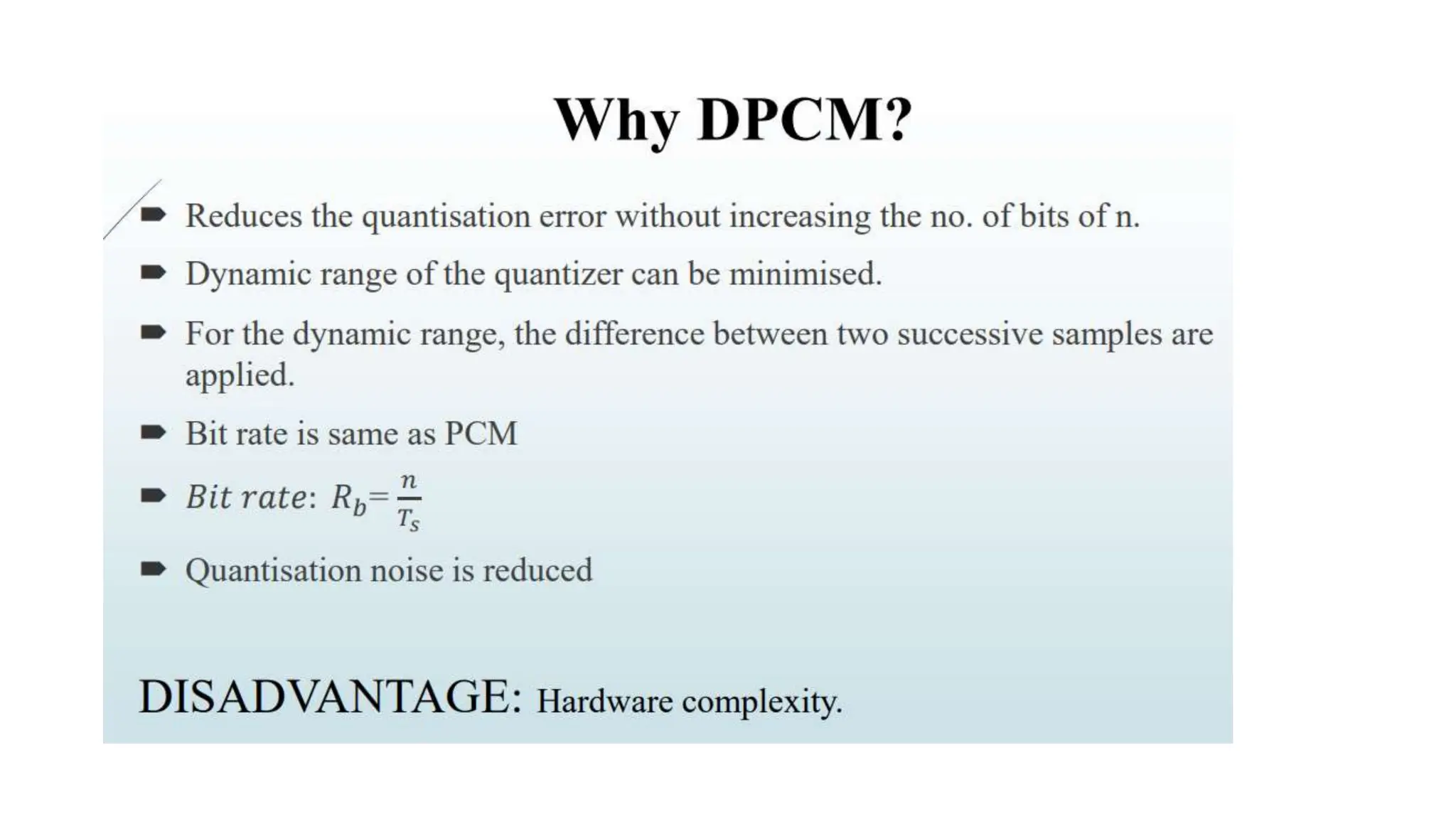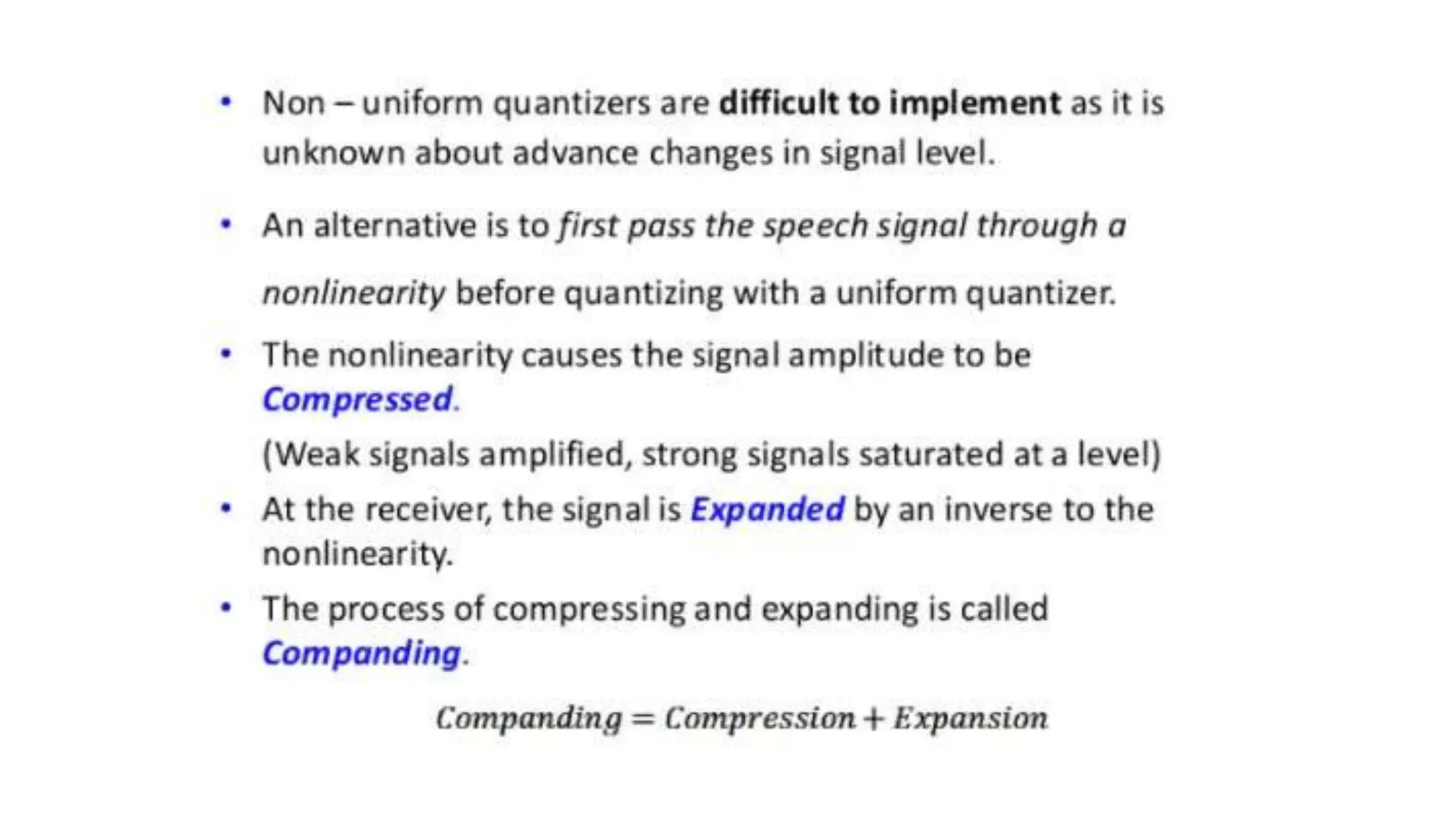 The document discusses non-uniform quantization and differential pulse code modulation (DPCM), highlighting redundancy in sampled signal values and the importance of reducing this redundancy to decrease bit rate. It then introduces delta modulation, characterized by a higher sampling rate and smaller quantization steps, resulting in a simpler design and moderate quality of output. The delta modulator includes a 1-bit quantizer and delay circuitry, facilitating effective signal representation.