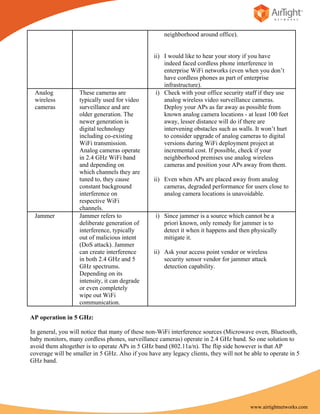 The document provides a guide on combating non-wifi interference in enterprise environments, highlighting various sources like microwaves, Bluetooth, baby monitors, and cordless phones, most of which operate on the 2.4 GHz band. It suggests deploying access points (APs) away from these interference sources and considering moving to the 5 GHz band for better performance, while noting the potential coverage limitations. Additionally, it discusses the risks posed by jammers and recommends detection capabilities as a countermeasure.