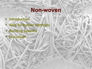 A non-woven fabric is made directly from fibres without creating yarn first. It is produced by bonding or interlocking fibres using mechanical, chemical, thermal, or solvent bonding. Non-woven fabrics have a higher production rate than woven or knitted fabrics and are cheaper to manufacture. While they can be engineered for specific properties, non-wovens do not match the aesthetics of conventional fabrics. Current major uses of non-wovens include geotextiles, medical products, disposable goods, and filters.