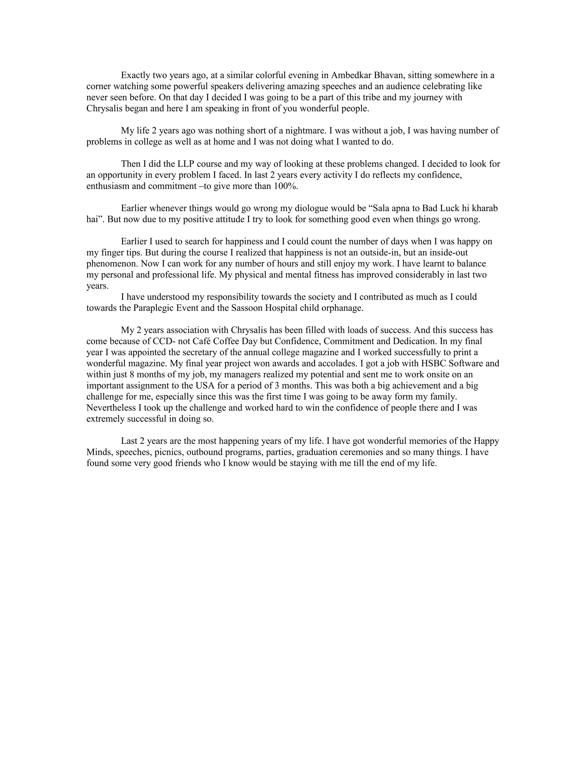The speaker describes how their life two years ago was difficult, with problems at work, school, and home. They took a LLP course which changed their perspective, helping them see opportunities in problems and approach everything with confidence, enthusiasm, and commitment. This positive attitude helped them find happiness from within rather than relying on external factors. Over the past two years with Chrysalis, the speaker has had professional successes, contributed to their community, developed strong friendships, and gained valuable life experiences.