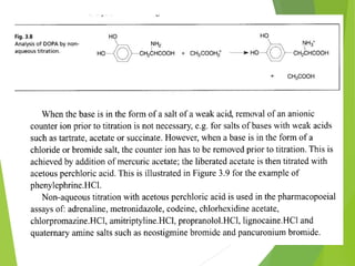 Non-aqueous titrations involve using a non-aqueous solvent instead of water. They are used when the reactant is insoluble in water, reactive with water, or too weak an acid or base. The document discusses different types of non-aqueous solvents and their properties, as well as considerations for non-aqueous titration procedures and methods. Common solvents, titrants, and indicators used are outlined. Examples of titrating weak bases with perchloric acid in acetic acid and weak acids with sodium methoxide are provided.
