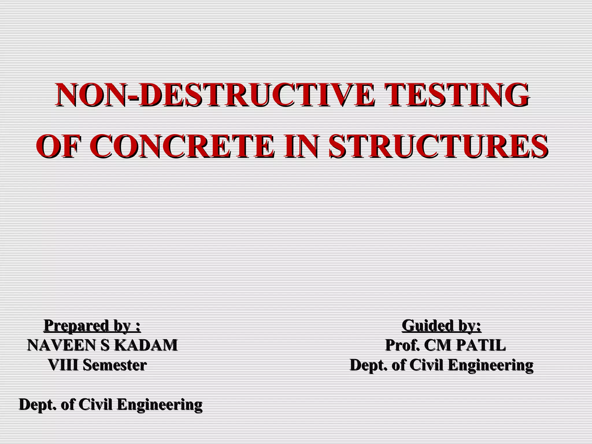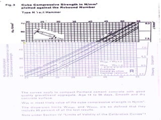 Ultrasonic pulse velocity testing, rebound hammer testing, and cover meter testing are three common non-destructive testing methods for concrete structures. Ultrasonic pulse velocity testing uses transducers to transmit and receive ultrasonic pulses through concrete to assess properties like strength and uniformity without damage. Rebound hammer testing measures surface hardness through a spring-controlled hammer's rebound, indicating relative concrete strength. Cover meters use electromagnetic principles to locate and measure rebar cover thickness in concrete. Non-destructive testing provides important information on structural condition and performance without damaging the structure.