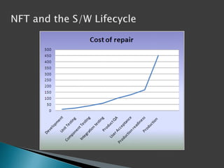 This document discusses the importance of non-functional testing (NFT) in software development. It defines NFT as testing aspects of a product that are not direct functional requirements, such as performance, reliability, security, and usability. The document recommends implementing NFT throughout the entire development lifecycle from development to post-production in order to reduce risks, costs, and improve quality. It provides examples of different types of NFT and emphasizes the resources required to properly perform serious NFT.