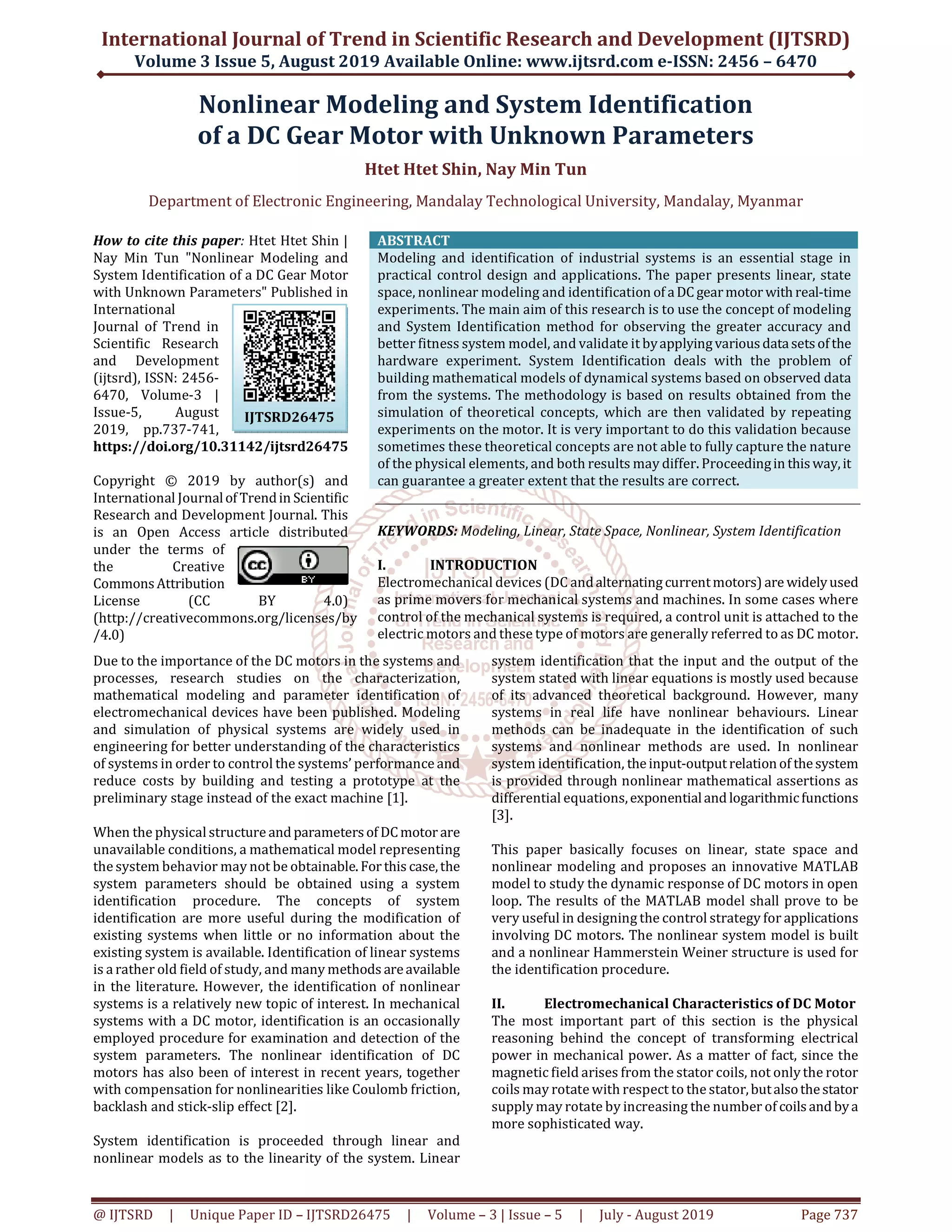 The paper discusses a methodology for nonlinear modeling and system identification of a DC gear motor using various datasets from real-time experiments. It highlights the significance of accurately modeling electromechanical systems, particularly focusing on linear, state-space, and nonlinear approaches to improve control strategies. The research demonstrates that the nonlinear Hammerstein-Wiener model significantly outperforms linear models in terms of accuracy, achieving a fitness of 94.2% compared to other modeling methods.