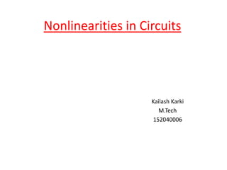 Nonlinear circuits contain components like transistors and diodes whose outputs do not vary linearly with input. This nonlinearity generates harmonics in addition to the fundamental frequency at the output. It is important to study nonlinear circuit behavior because harmonics produced by nonlinear devices can cause electromagnetic interference issues. While ideal circuit elements like resistors and capacitors demonstrate linear characteristics, practical components become nonlinear at high frequencies, requiring their impedance models to account for frequency-dependent behavior to solve electromagnetic compatibility problems.