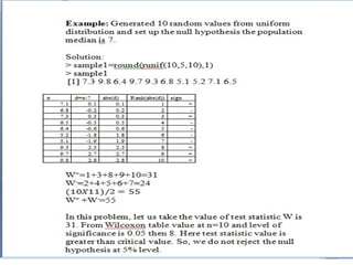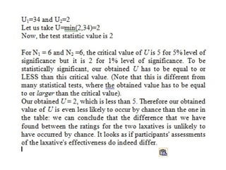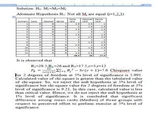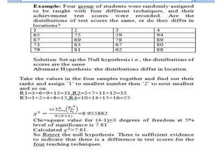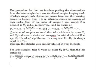 This document discusses various nonparametric statistical tests, including the Wilcoxon signed rank sum test, Mann-Whitney U test, Kruskal-Wallis test, and Friedman test, explaining their procedures, hypotheses, and applications for analyzing ordinal and nominal data. It highlights how these tests are used in situations where the assumptions of parametric tests cannot be met, providing step-by-step instructions for conducting each test. Additionally, it includes a table categorizing each test based on the number of variables and measurement scales.