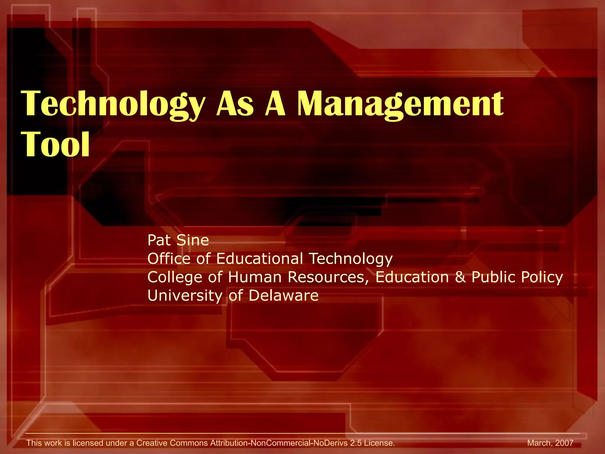 The document discusses various technology considerations for non-profit management and strategic planning. It covers topics like hardware and software purchasing, security, networking, using the web and online communication tools. When developing a technology plan, it is important to focus on organizational goals, include stakeholders, and budget for total cost of ownership beyond just initial purchases. Technology skills and training staff are also important factors.