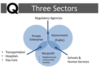 The document discusses key aspects of effective nonprofit governance and management. It emphasizes that nonprofit boards must work as equal partners with operational staff. Additionally, it highlights the importance of clarifying roles and responsibilities between boards and staff to coordinate their work. Finally, it stresses that nonprofit organizations should engage in strategic planning and lifecycle analysis to help guide their work.