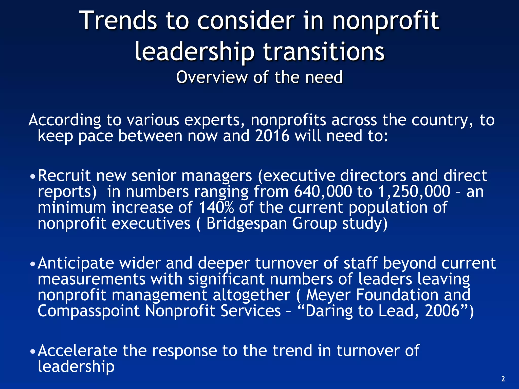 The document discusses trends in nonprofit leadership transitions that will need to be addressed between now and 2016. It notes that nonprofits will need to recruit over 600,000 to 1,250,000 new senior managers, and anticipate increased turnover beyond current levels. This is driven by factors such as the increasing number of nonprofits, baby boomer retirement, and lack of experienced younger professionals. Proper transition management is necessary to stabilize organizations and orient new executives through phases of ending the old relationship, establishing an interim plan, and launching the new beginning.