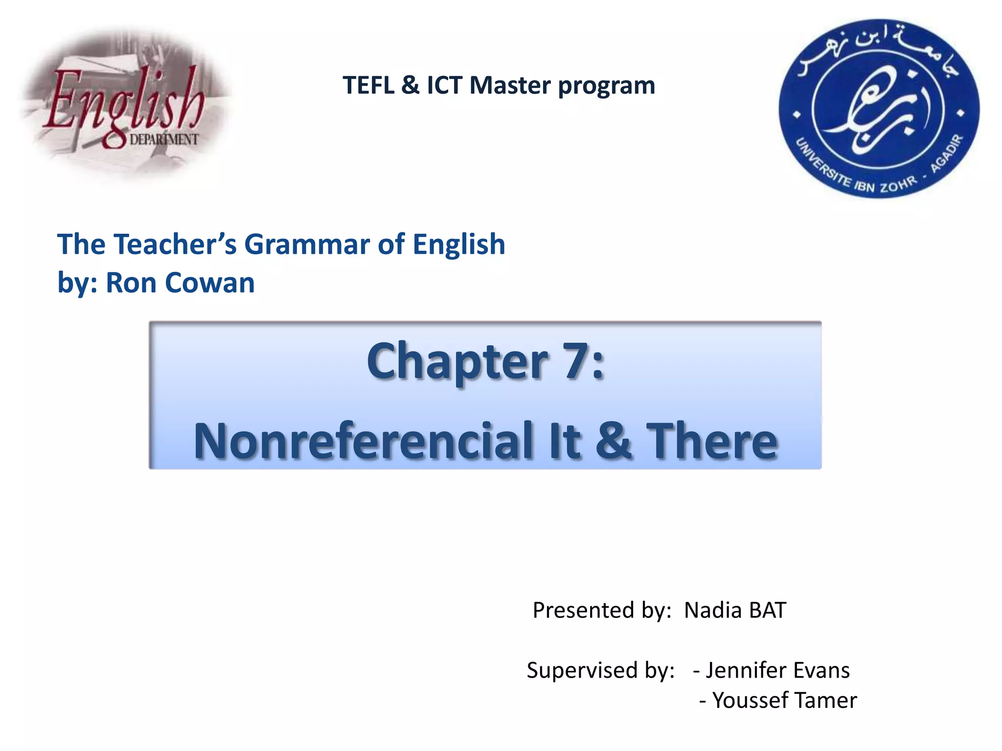 This document provides an overview of nonreferential it and there in English. [1] It discusses how these words commonly function as pronouns but can also be used nonreferentially to introduce new information, acknowledge existence, or shift focus. [2] Examples are given of correct and incorrect usages. [3] Common problems English language learners face include omitting relative pronouns and incorrectly using polarity items like "any" with nonreferential there.