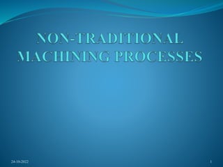 This document discusses various non-traditional machining processes. It begins by explaining that non-traditional machining is used when workpiece materials are too hard or complex shapes are required. It then classifies non-traditional machining into three categories: mechanical energy processes like ultrasonic machining; chemical/electrochemical processes like electrochemical machining; and thermal/electrothermal processes like laser beam machining. For each process, it provides a brief overview and discusses applications and key process parameters.
