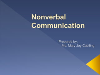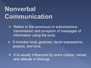 This document discusses nonverbal communication and its various types. It defines nonverbal communication as the conscious or subconscious transmission of messages through body gestures, facial expressions, posture, and tone. It is influenced by culture, values, and feelings. The document then describes seven types of nonverbal communication: kinesics (body movements), proxemics (use of space and distance), haptics (touch), paralanguage (vocal cues like tone), chronemics (role of time), appearance, and artifacts (objects that convey messages). Examples are provided for each type.
