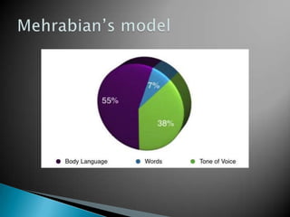This document defines and discusses nonverbal communication. It begins by stating that nonverbal communication includes bodily actions and vocal qualities that accompany verbal messages. It then discusses some key points about nonverbal communication, including that only 7% of a message's effect is from words, while 93% is from nonverbal means. It also notes that over 65% of social meaning comes from nonverbal cues. The document goes on to classify and describe different types of nonverbal communication, including meta communication, kinesic communication, leakage, emblems, illustrators, body manipulators, facial expressions, and regulators like eye movement. It provides examples of each type and discusses the importance of nonverbal communication skills.