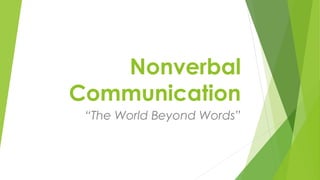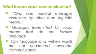 Nonverbal communication conveys over 60% of messages. There are 7 types: proxemics (distance), haptics (touch), chronemics (time), kinesics (body language), artifacts (appearance), vocalics (paralanguage), and environment. These types communicate through behaviors like facial expressions, eye contact, gestures, and dress. Nonverbal signals can repeat, substitute, complement, accent, regulate, or contradict verbal messages to influence perceptions and behaviors. Understanding nonverbal communication improves interactions.