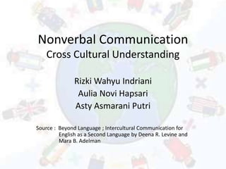 This document discusses nonverbal communication and how it varies across cultures. It notes that nonverbal communication, such as facial expressions, gestures, eye contact and physical space, conveys over 90% of messages. However, the meanings of nonverbal cues depend on cultural norms. For example, behaviors seen as friendly in one culture, such as physical contact, may be inappropriate in another. The document advises studying a culture's nonverbal communication styles to avoid misinterpretations. Overall, it emphasizes that nonverbal signals are strongly influenced by cultural conventions.