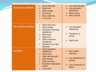 - Raw materials used like cotton, rayon, polyester and different fiber properties they provide.