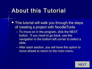 The tutorial walks through setting up a NoodleTools project, including adding citations, taking notes, sorting notecards into an outline, and exporting the outline for writing a paper while maintaining proper citations.