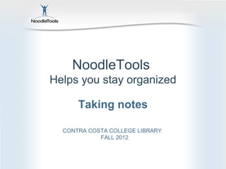 NoodleTools is a digital organizer that helps students take notes, organize sources, and create outlines and projects. It allows students to copy quotes and information from sources onto virtual notecards. Students can add their own analysis and ideas to each notecard. Notecards can be organized into piles representing different topics or subtopics. Outlines can be created by dragging the notecards and piles into a structured format. The digital organization tools help students stay organized during research projects and ensure accurate citation of sources.