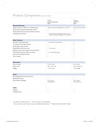 The document compares the nook eReader by Barnes & Noble and the Amazon Kindle 2. The nook has several advantages over the Kindle including a color touchscreen, support for 3G wireless networks and free WiFi in B&N stores, expandable memory via micro SD cards, ability to lend digital books, replaceable covers, and support for additional devices beyond just Kindle. However, the Kindle has some advantages like text-to-speech and ability to wirelessly email documents. Overall, the nook appears to offer more features while the Kindle focuses more on just ebook reading.