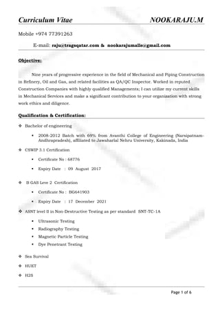 Nookaraju M has over 9 years of experience in mechanical and piping construction in oil, gas, and related facilities as a QA/QC inspector. He holds a Bachelor's degree in engineering and various certifications including CSWIP 3.1, B GAS Level 2, and ASNT level II in non-destructive testing. His work experience includes projects in Qatar and Malaysia for companies such as Qatar Petrochemical Company, Ras Laffan Olefins Company, Hyundai, and Qatar Vinyl Company, where he served as a welding inspector responsible for tasks like welding procedure qualification, inspection, and non-destructive testing.