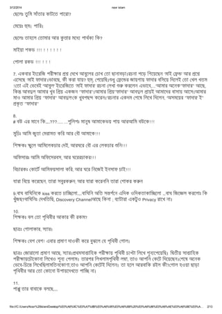2/13 ছেলঃ তুিম সাঁতার কাটেত পােরা? মেয়ঃ ম। পাির। ছেলঃ তাহেল তামার আর কু ার মেধ পাথক িক? মাইয়া শকড !!! ! ! ! ! ! ! পালা রকড !!! ! ! ! 7. একবার ইংেরিজ পরী ার দেখ আবুেলর চাখ তা ছানাবড়া।রচনা পেড় িগেয়েছন ‘মাই ’ আর ে এেসেছ ‘মাই ফাদার’।ভাবেছ, কী করা যায়? , পেয়িছ। ধু ে র জায়গায় ফাদার বিসেয় িদেলই তা খল খতম ! তা এই ভেবই 'আবুল' ইংেরিজেত ‘মাই ফাদার’ রচনা লখা করেলন এভােব,...‘আমার অেনক"ফাদার" আেছ, িক আব ল আমার খুব ি য় একজন "ফাদার"।আমার ি য়"ফাদার" আব ল ায়ই আমােদর বাসায় আেস।আমার মাও আমার ি য় "ফাদার" আব ল' ক খুবপছ কেরন।’রচনার একদম শেষ িলেখ িদেলন, ‘অসমেয়র "ফাদার' ই" কৃ ত "ফাদার" 8. # বউ এর মােন িক...???..... ...পুিলশঃ মানুষ আমােকভয় পায় আরআিম বউেক!!! মুিচঃ আিম জুতা মরামত কির আর বৗ আমােক!!! িশ কঃ ুেল আিমেলকচার দই, আরঘের বৗ এর লকচার িন!!! অিফসারঃ আিম অিফেসরবস, আর ঘেররচাকর!!! িবচারকঃ কােট আিমফয়সালা কির, আর ঘের িনেজই ইনসাফ চাই!!! যারা িবেয় কেরেছন, তারা সবুরক ন; আর যারা কেরনিন তারা শাকর ক ন 9.বাঘ বািঘিনেক kiss করেত চাি েলা...বািঘিন অিত স পেন এিদক ওিদকতাকাি েলা ..বাঘ িজে স করেলাঃ িক খুঁজছ?বািঘিনঃ দখিতিছ, Discovery Channelআেছ িকনা ; ব াটারা একটুও Privacy রােখ না। 10. িশ কঃ বল তা পৃিথবীর আকার কী রকম? ছা ঃ গালাকার, স ার। িশ কঃ বশ বশ! এবার মাণ দাওকী কের বুঝেল য পৃিথবী গাল। ছা ঃ জারােলা মাণ আেছ, স ার। থমসা ািহক পরী ায় পৃিথবী চ া িলেখ শূন েপেয়িছ। ি তীয় সা ািহক পরী ায়েচৗেকানা িলেখও শূন পলাম। তারপর িলখলামপৃিথবী ল া, তাও আপিন কেট িদেয়েছন। শেষ অেনক ভেব-িচে িলেখিছলামিতনেকাণা,তাও আপিন কেটই িদেলন। তা হেল আরবািক রইল কী? গাল হওয়া ছাড়া পৃিথবীর আর তা কােনা উপায়েদখেত পাি না। 11. পা ু তার বাবােক বলেছ...