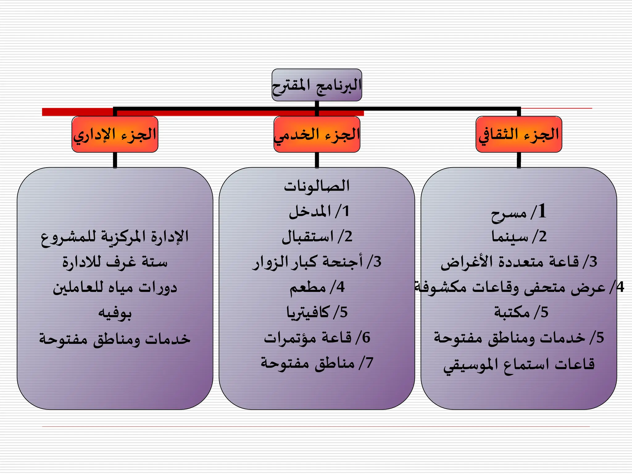 يتناول الوثيقة تصميم مركز ثقافي يتضمن عدة عناصر مثل المسرح، السينما، المكتبة، وقاعات متعددة الأغراض، مع التركيز على المعايير التصميمية والبيئية. كما يوضح أهمية توزيع المساحات والخدمات لتلبية احتياجات الزوار والفعاليات الثقافية. يتضمن النص تفاصيل عن البنية التحتية ومتطلبات المساحات المختلفة.
