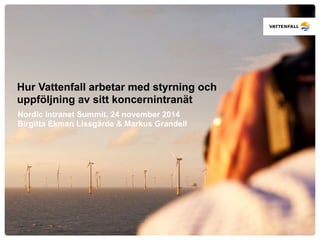 The document discusses Vattenfall's intranet development, detailing its history, current structure, and strategies for management and communication. It outlines a centralized intranet with a focus on collaboration, knowledge sharing, and a KPI framework to measure effectiveness and employee engagement. The strategy aims to enhance digital workplace capabilities and foster clearer internal communications among its 32,000 employees across multiple countries.