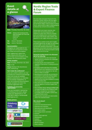 The 3rd Annual Nordic Region Trade & Export Finance Forum will take place on November 18, 2010 in Gothenburg, Sweden. It will discuss key concerns and priorities in the Nordic trade market following declines in export and import volumes and loan losses in the banking sector. Issues addressed last year such as the macroeconomic outlook and emerging market trade flows will again be covered through presentations, discussions and networking.