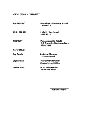 Norlita F. Mayes is a 31-year-old Filipino woman from Makati City. She has worked in various promodizer and enumerator roles since 2003. Her educational background includes graduating from Guadalupe Elementary School, Makati High School, and Pamantasan ng Makati with a Bachelor's degree in Education. She lists Joy Orbeta, Joybel Diaz, and Jerry Galvez as references.