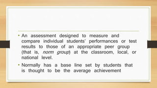 Norm-referenced assessments measure and compare individual student performance to a peer group or norm group at the classroom, local, or national level. The norming process establishes average achievement as the baseline by calculating norm-referenced scores based on a statistical selection of previous test takers. Norm-referenced tests are often multiple choice and based on national standards, and are used to identify specific learning disabilities, determine readiness, or make admissions decisions by comparing students to the norm group.