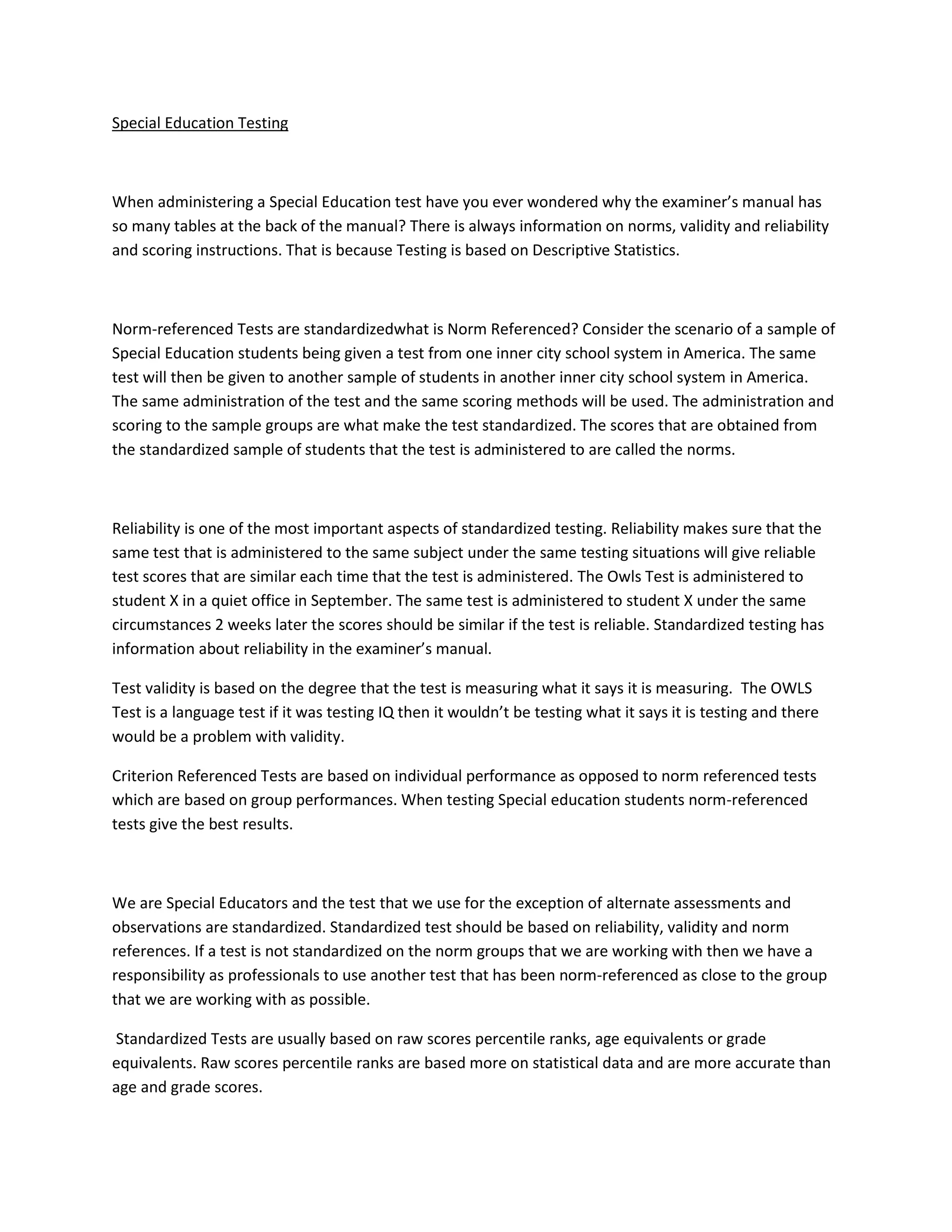 Standardized testing is based on descriptive statistics and norms. Norm-referenced tests compare a student's performance to the performance of other students in a standardized sample group. Reliability ensures tests produce consistent results, while validity confirms a test measures what it claims to measure, such as language versus IQ. Special educators should use norm-referenced tests that closely match their students' groups when possible. Common standardized tests include CELF, OWLS, TOLD, WPT, and ROVPVT/EOVPVT.
