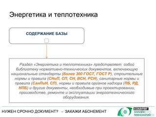 Документ описывает базу данных 'энергетика и теплотехника', содержащую нормативно-технические документы, необходимые для проектирования, производства и эксплуатации энергетического оборудования. В ней представлены стандарты и правила по различным направлениям, включая двигатели, турбины, атомные и гидроэлектростанции, а также холодильные технологии и альтернативные источники энергии. Кроме того, база данных помогает специалистам в подготовке технических заданий, контроле качества работ и выдаче заключений по проектной документации.
